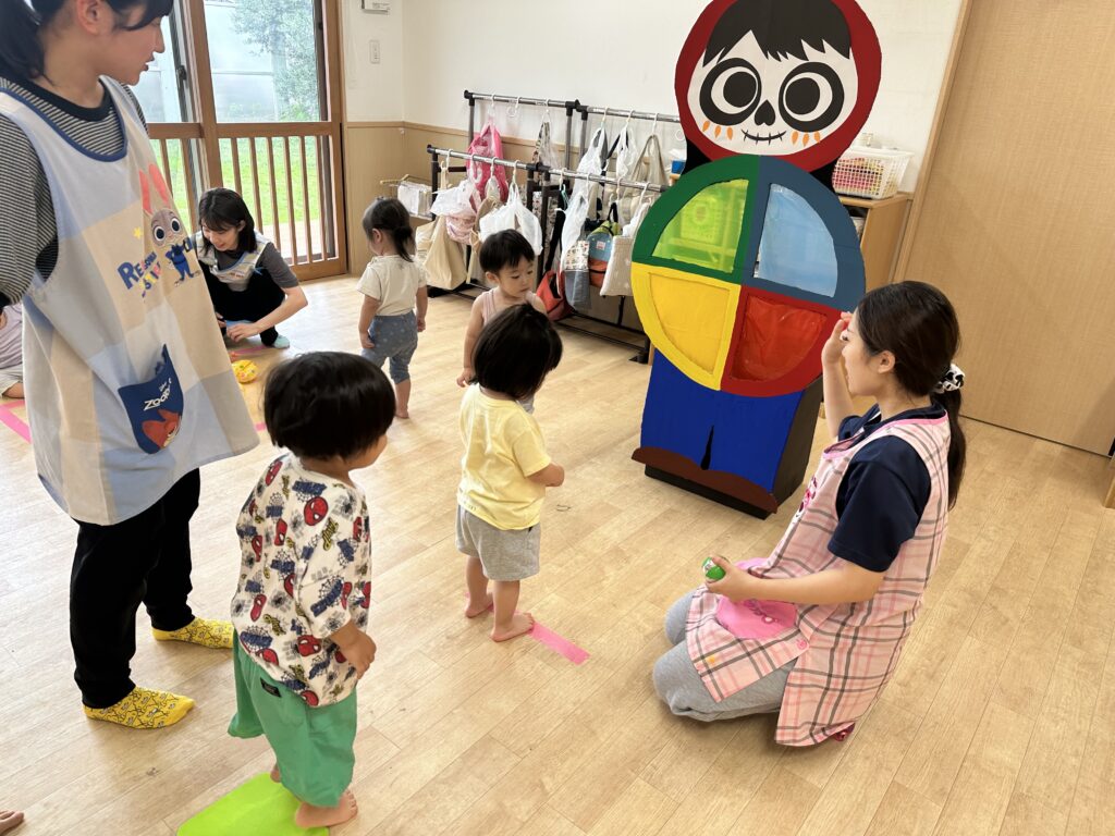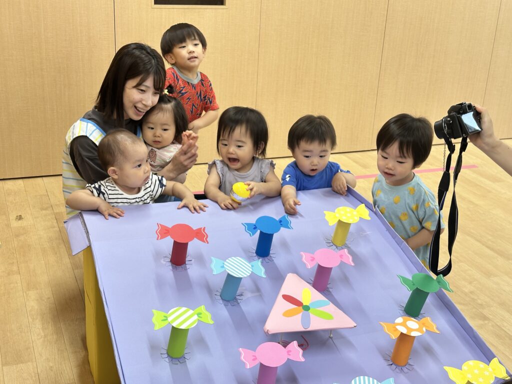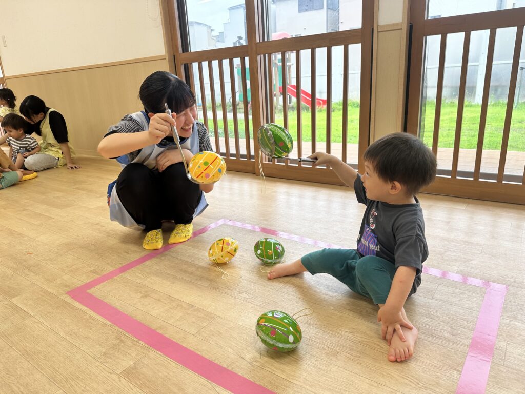 今日は、その時のゲームを使って 乳児クラスが夏祭りごっこをしました(*^^*)