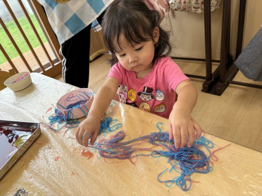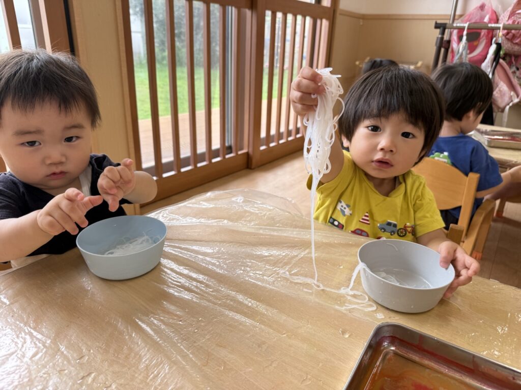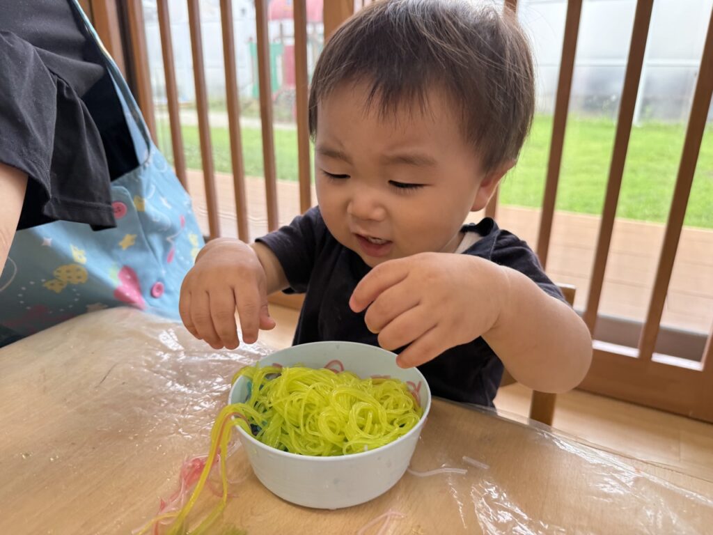 1人ずつ春雨を配ると不思議そうにしながらも自由に触る子どもたち🌟