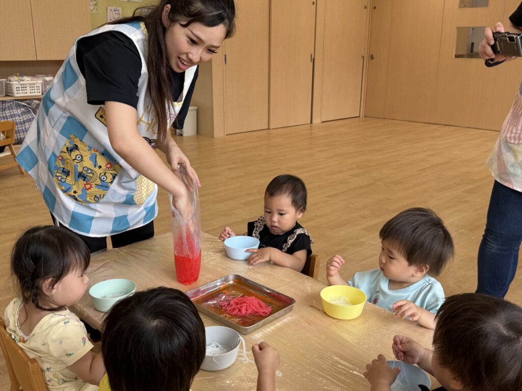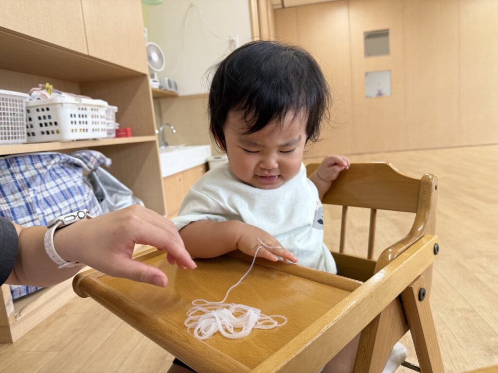今日は春雨を使って感触あそびをした、つぼみ組(0歳児クラス)・わかば組(1歳児クラス)の様子をお届けします!