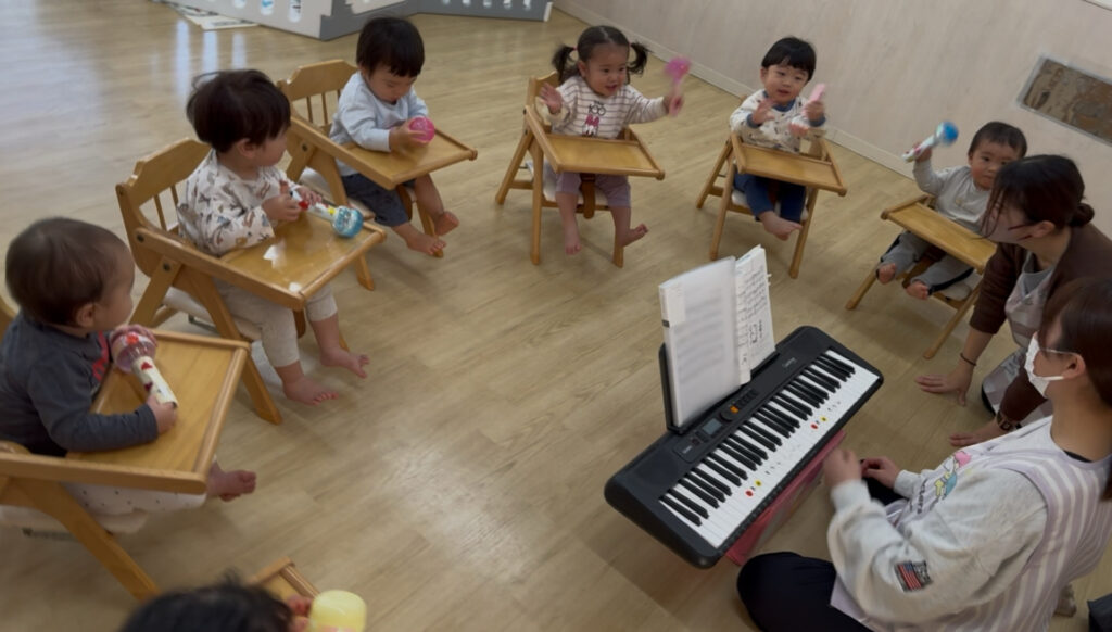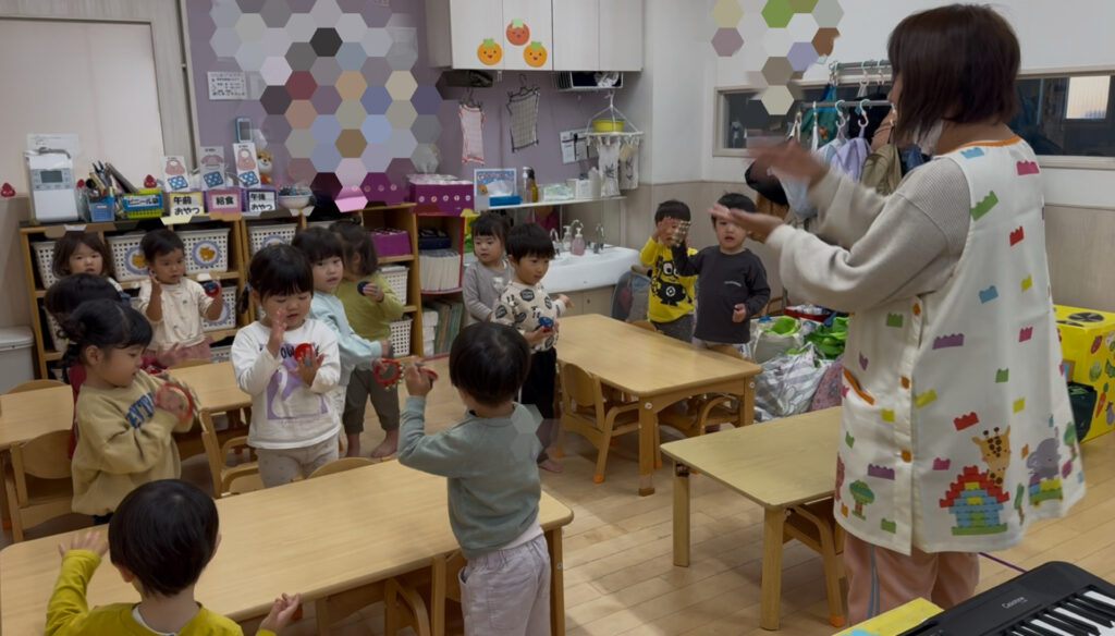 2歳児そよかぜ組ではなにやらカスタネットや鈴の音が!