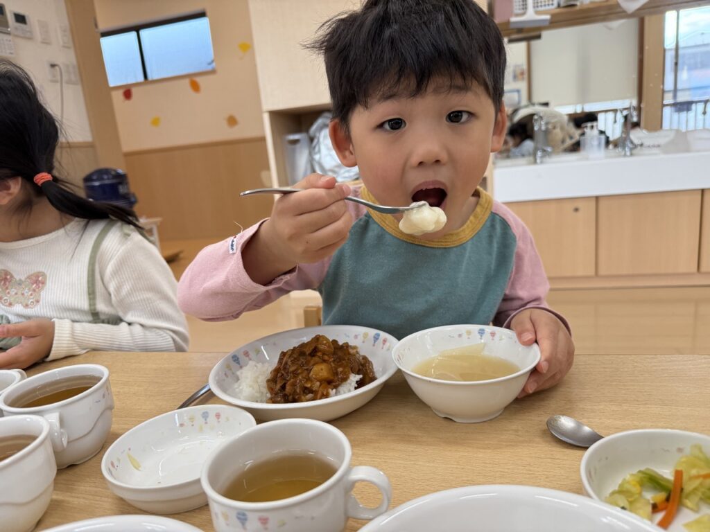幼児クラスは給食のお味噌汁にお餅を入れてたべました🥄