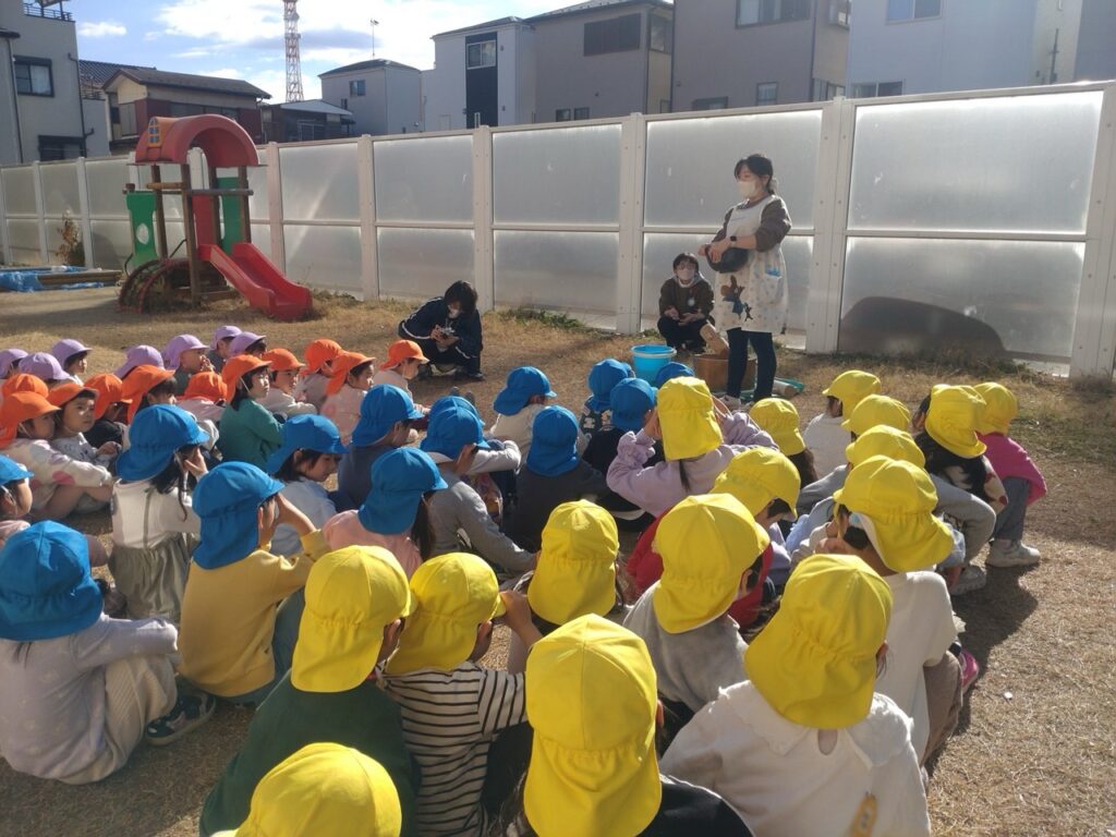 そよかぜ組(2歳児クラス)からいなほ組(5歳児クラス)が園庭に集まり行事に参加します!