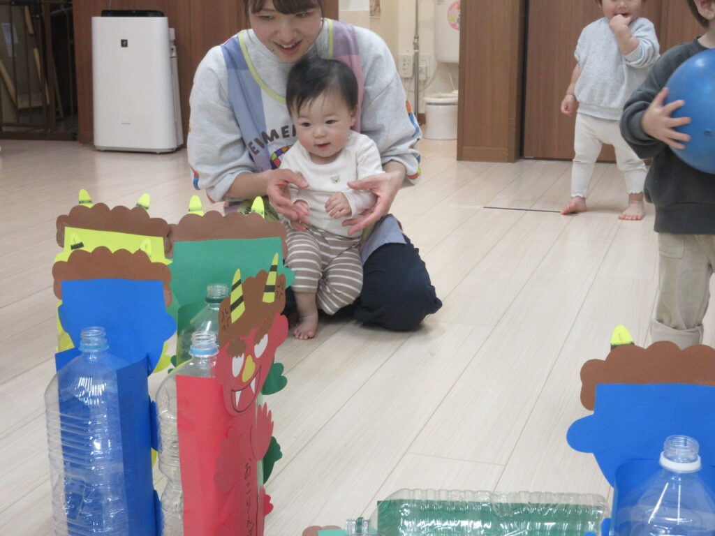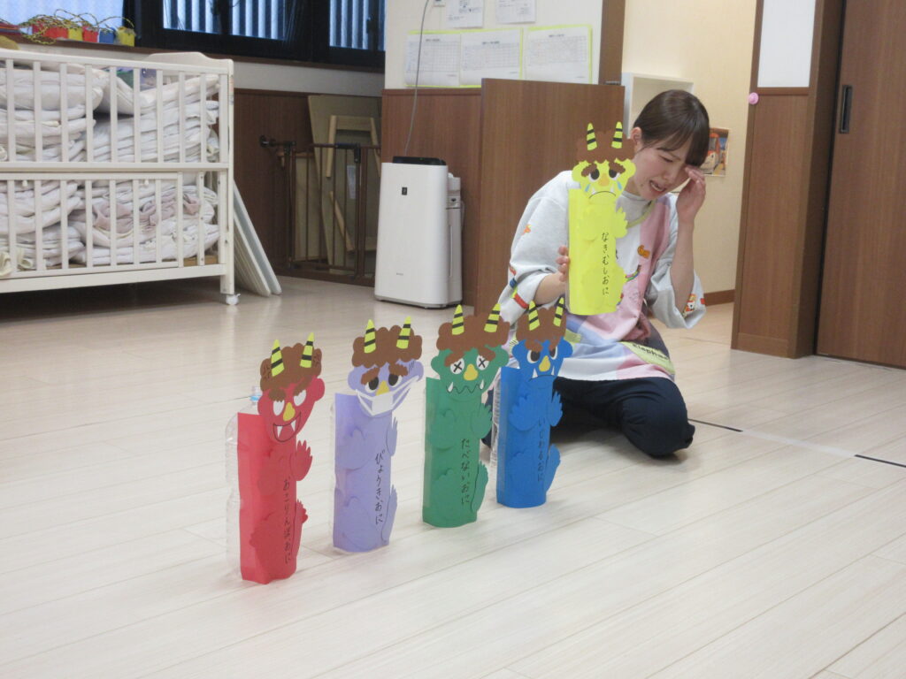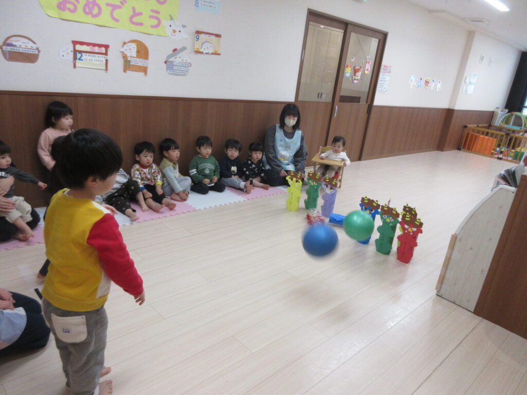 ゴムボールを豆に見立て、「おにはー そと!!」と言いながら倒していきます。