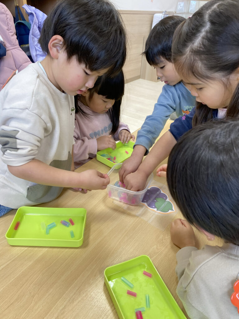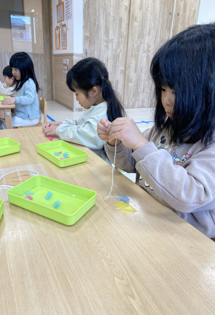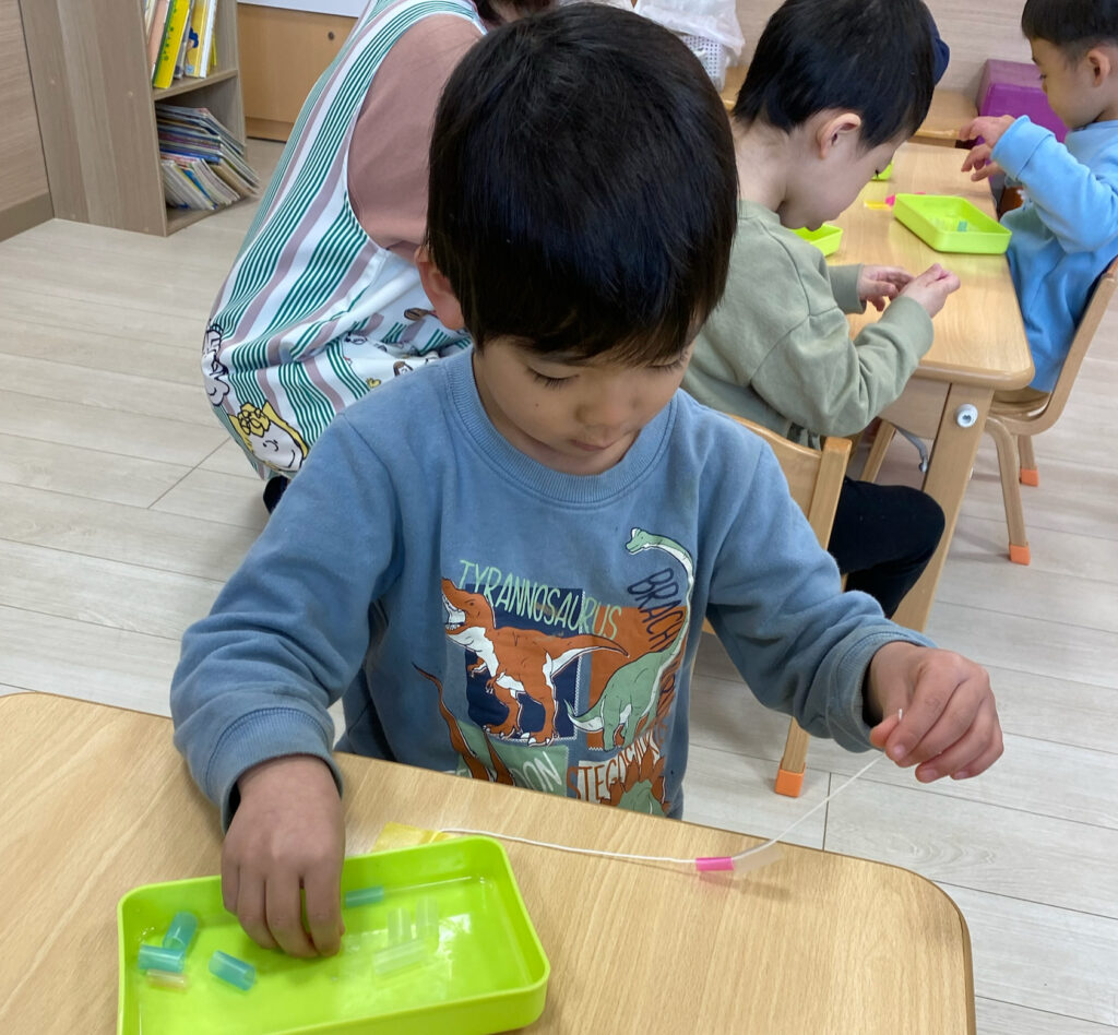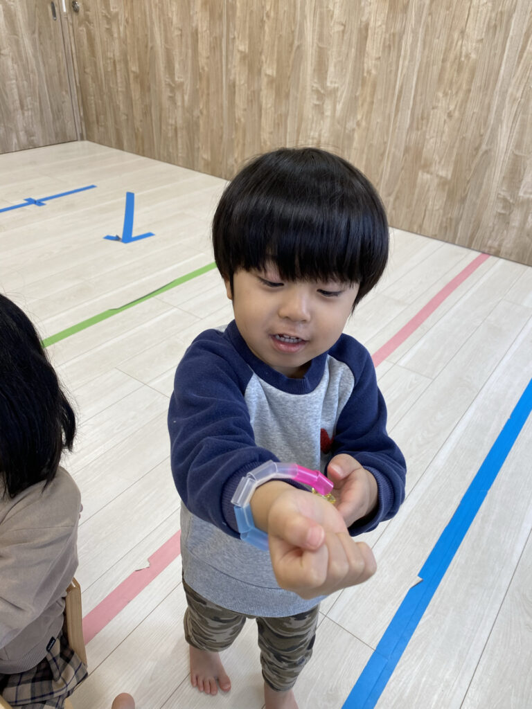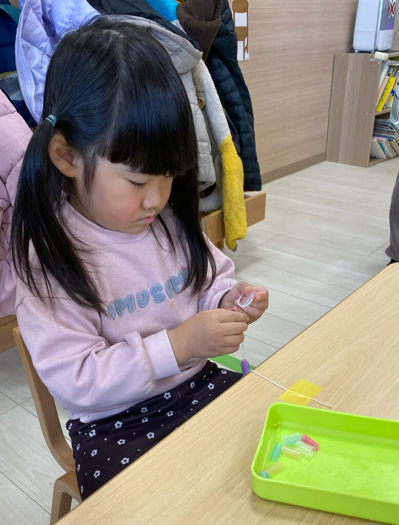 お友だちやお家の人に「大好き」を伝えようと、ストローのブレスレット作りをしていたひだまり組(3歳児)さんの様子をお伝えします🎵
