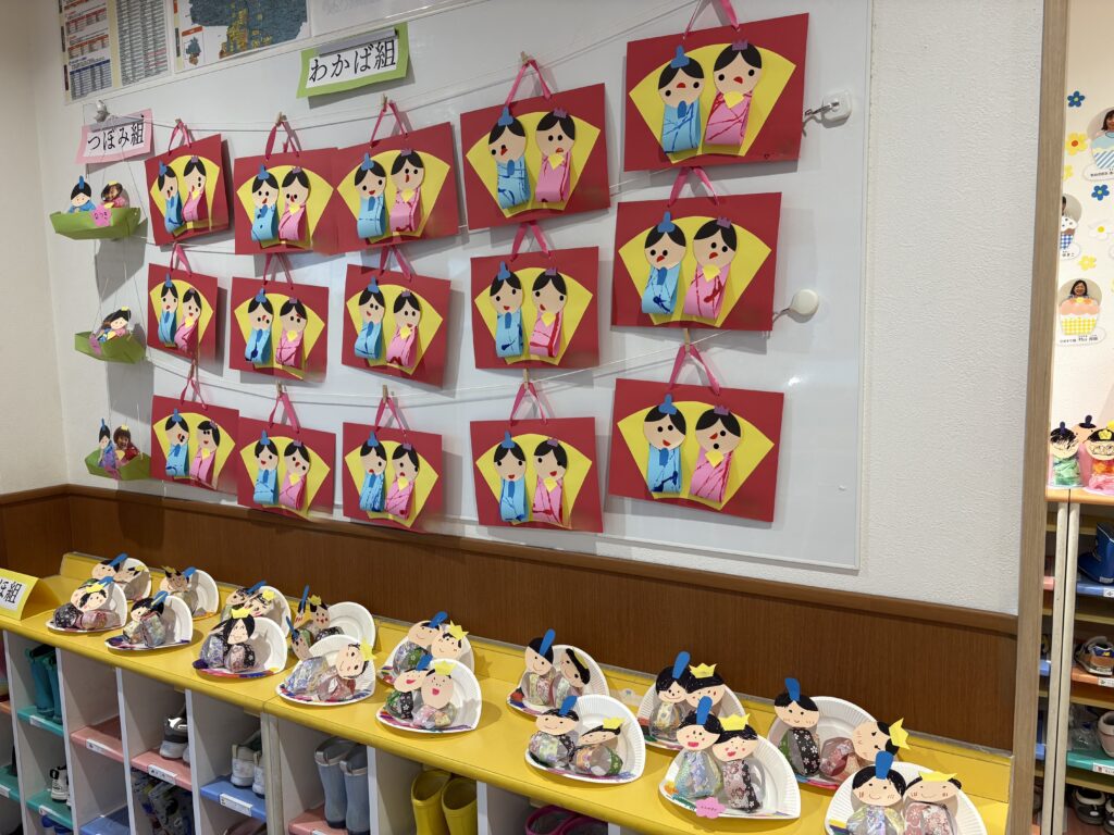 みんなが制作したお雛様を玄関に飾りました。