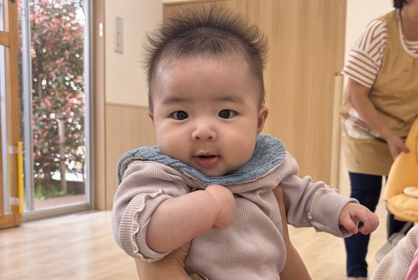 先生の膝の上に座り、ごきげんなつぼみ組さん(0歳児)!